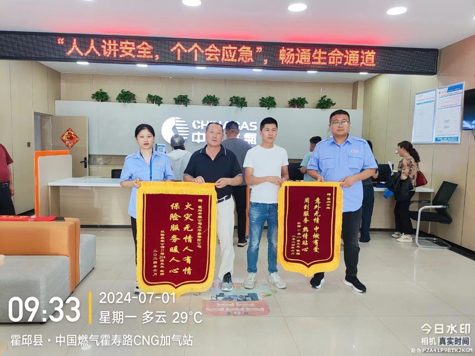 7月1日早上,玖隆皇家公館陳先生帶著錦旗來到霍邱中燃,送上了意外無情中燃有愛,周到服務(wù)熱情貼心“火災(zāi)無情人有情,保險(xiǎn)服務(wù)暖人心”兩面錦旗,以此表達(dá)他對(duì)霍邱中燃的感激之情。